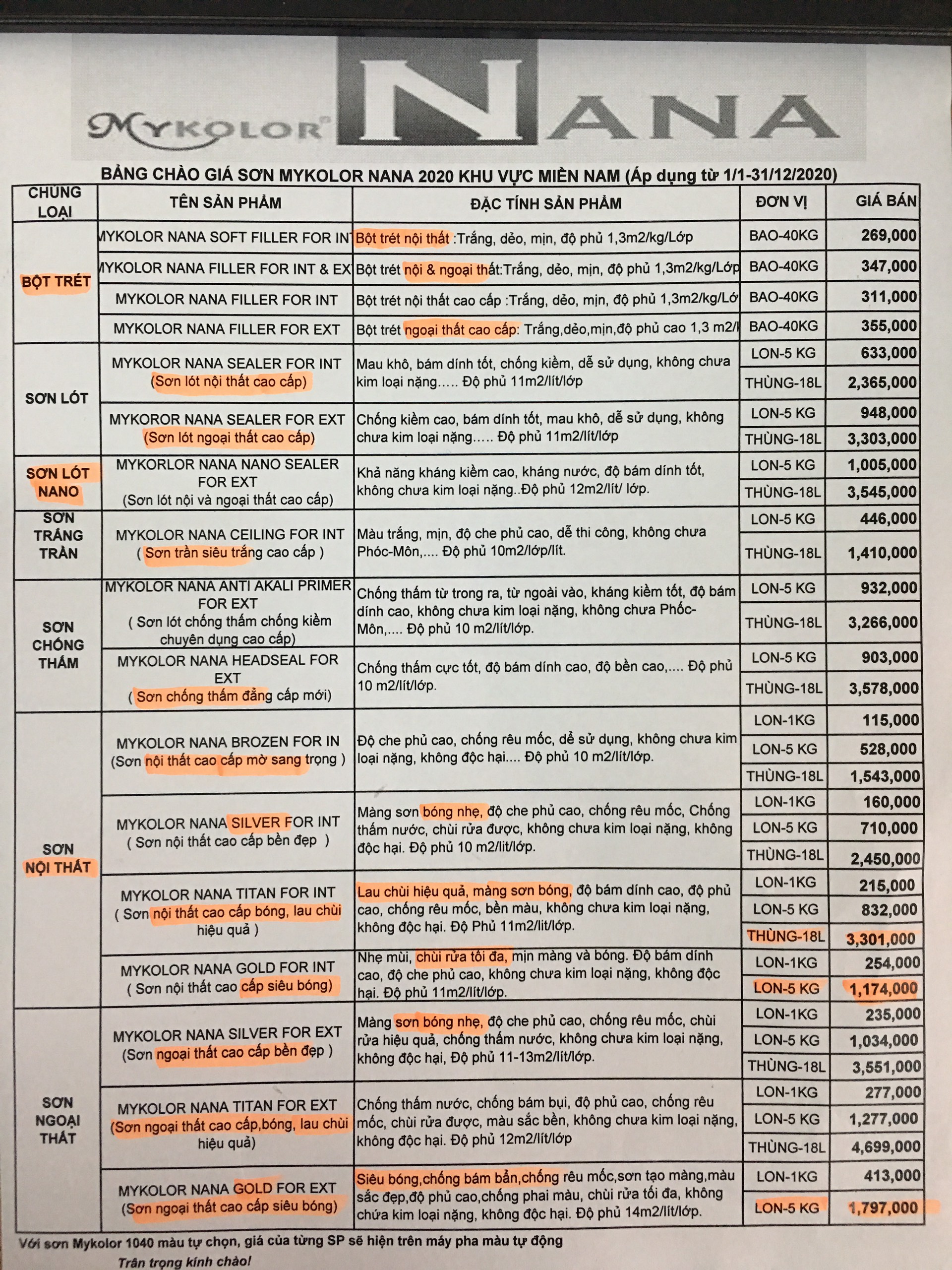 Bảng giá sơn Mykolor Nana được cập nhật mới ngày 20 tháng 1 năm 2026 Để có chi tiết giá bán và giá chiết khấu theo chương trình của công ty kết hợp nhà phân phối sơn Mykolor - Liên hệ 0901 34 57 58